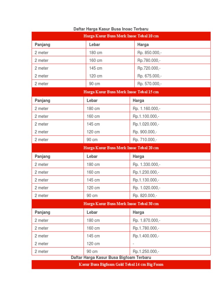 Kasur busa inoac, murah ka sur busa empuk harga pabrik berkualitas tinggi (juga jual latex) kasur busa super yang 100% asli? Atau bisa pilih belgium kasur busa [180 x 200 x 14 cm/ ukuran no. Daftar harga kasur busa super yellow. Kasur lipat busa super quilting 90x190x6cm kain springbedrp190.000: Katalog produk kasur busa super dari royal foam harga dari kasur busa royal foam beragam tergantung ukuran, tebal dan garansinya.